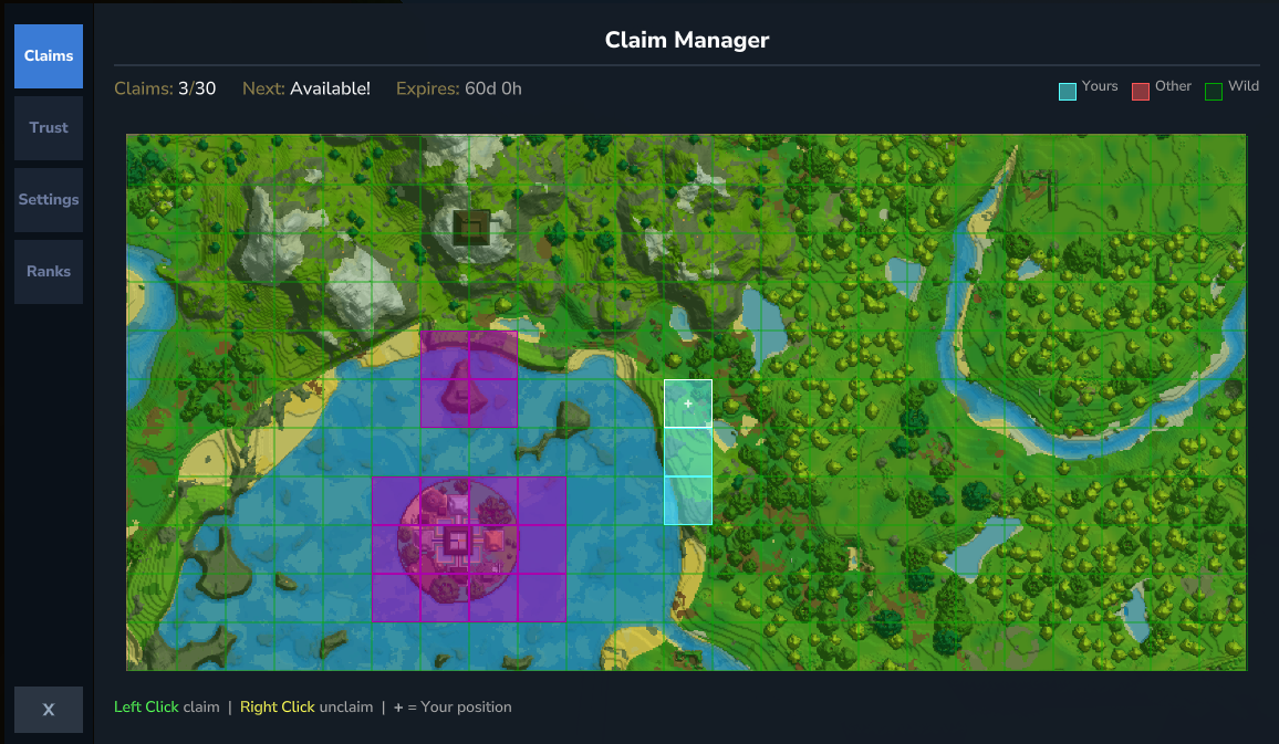 - Claims will be visible on the world map from either player claims or protect regions placed by the admins. Players are unable to claim any land that already has been claimed by another player or admin.