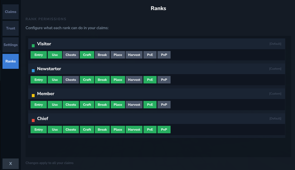 - Visiting the ranks tab will allow you to edit permission of players in your claim.